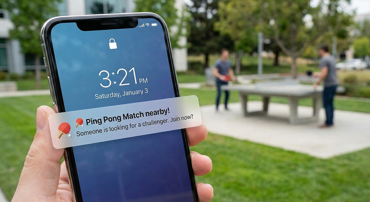 Need a partner for ping pong? Or just looking for a lunch buddy? Create an AreYouIn Card and nearby users get an instant push notification. No weeks of planning—just real-time connection.